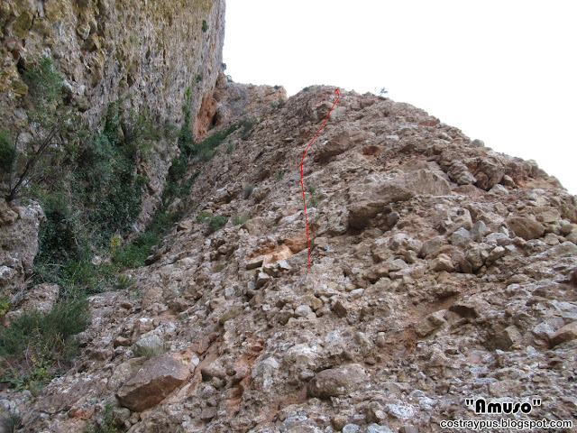 Justo antes de llegar a una brecha, seguiremos un senderillo que sale a la izda (hito), su trazado se eleva por un contrafuerte paralelo a la pared. De él sale algún desvío hacia vías que comienzan a la derecha. Continuaremos ascendiendo por él hasta situarnos en la vertical de la vía, un senderillo nos lleva hasta su inicio (45’; inscripción “HR”).